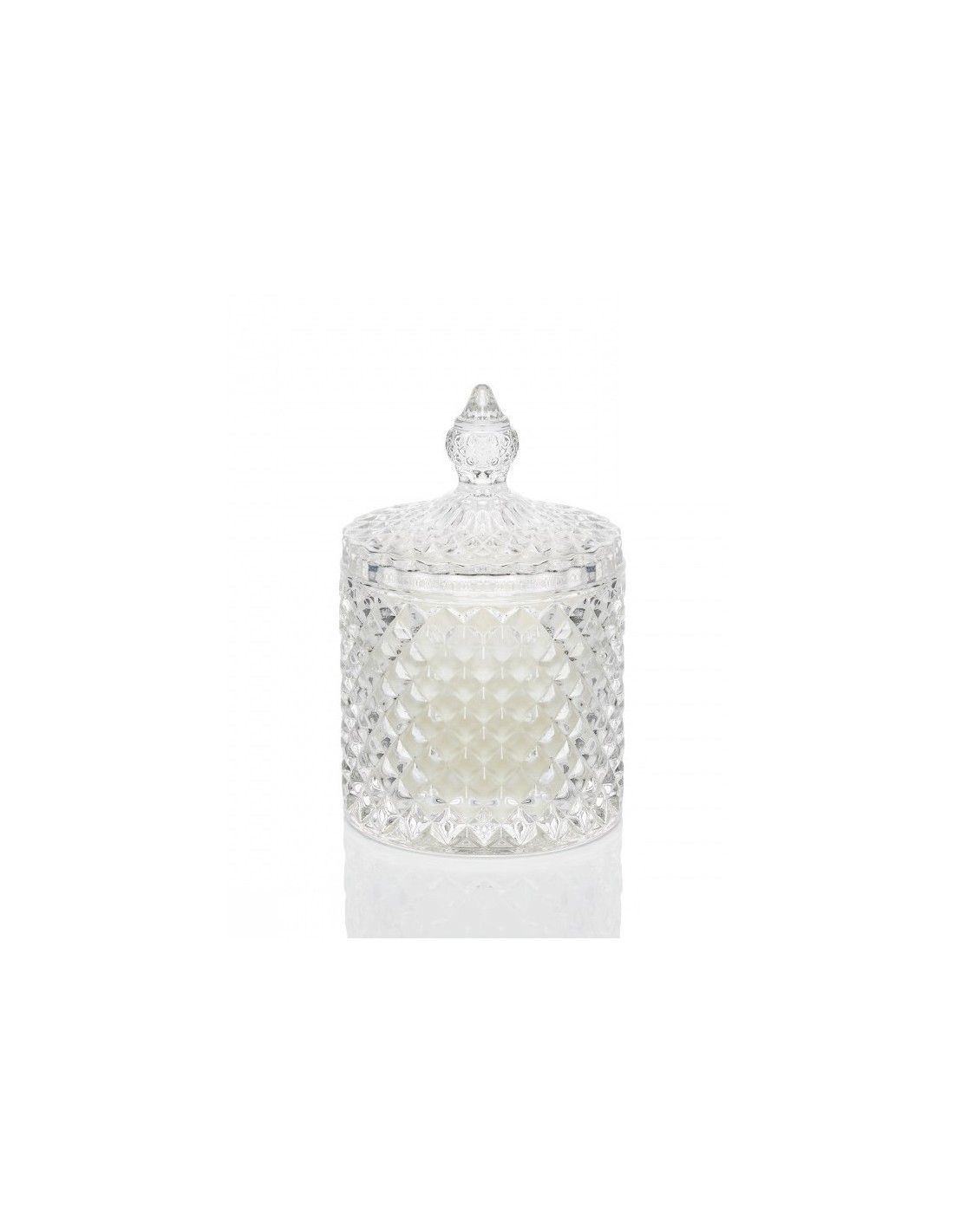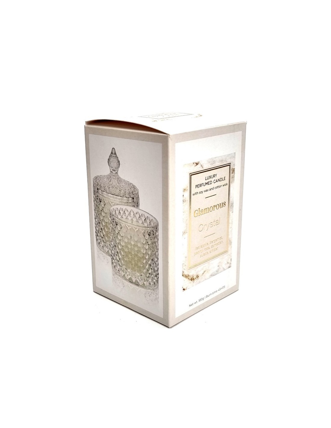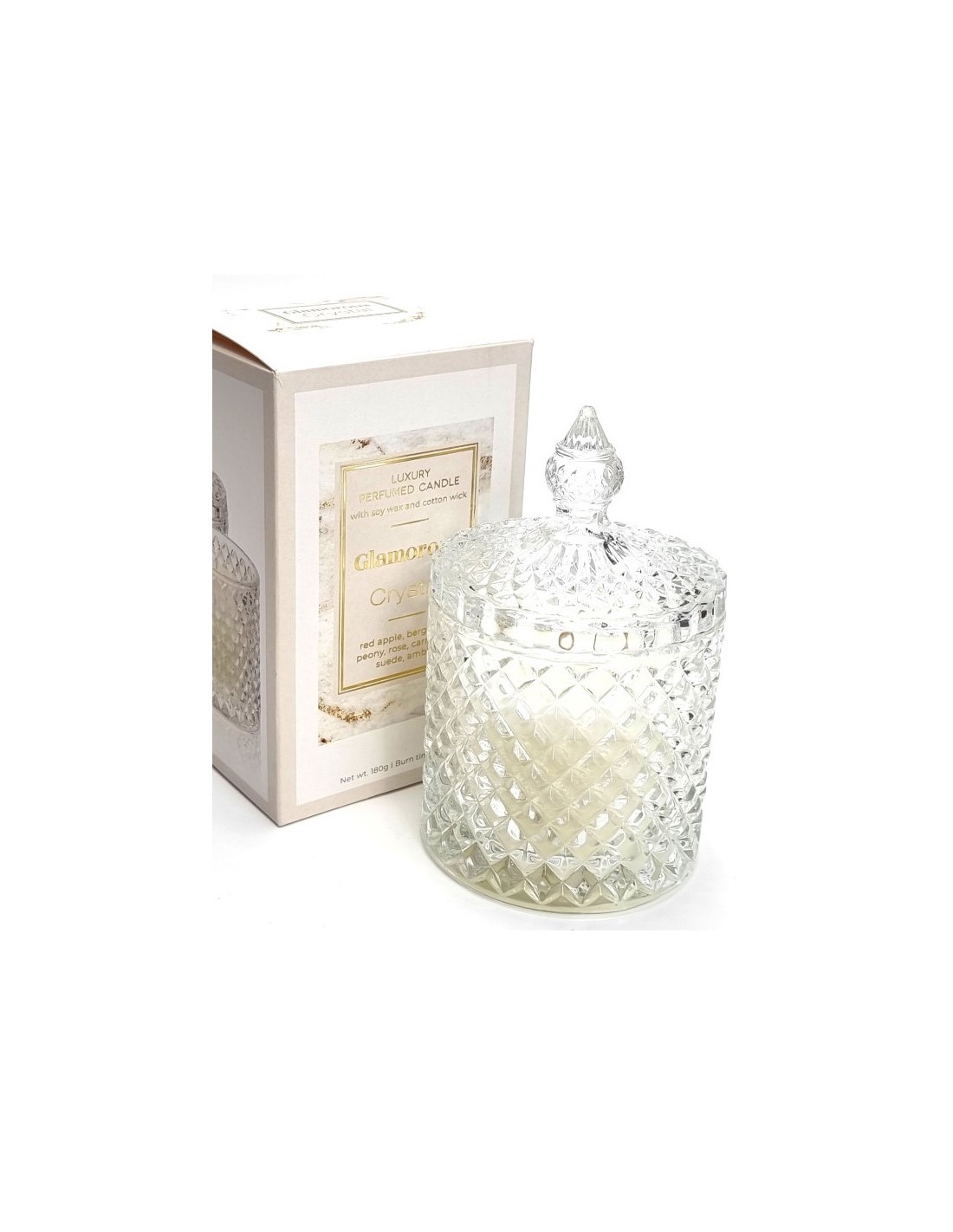 GLAMOROUS CRYSTAL LUXURY - aromatinė sojų vaško žvakė, įlieta į stiklinį indeli su dangteliu.